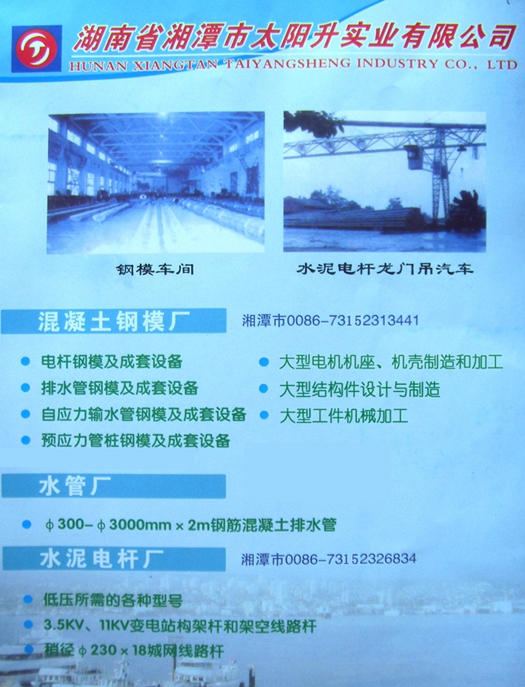 1、鋼模制造廠: ①電桿鋼模及成套設備和技術服務; ②給排水管鋼模及成套設備和技術服務; ③預應力管樁鋼模及成套設備和技術服務; ④預應力高強絲生產成套設備和技術服務; ⑤大型結構件設計與制造。 2、預應力水泥電桿廠: 高、低壓線路桿和構架桿,錐型;等徑 、系列配件。 3、排水管廠: 生產Φ200~Φ400×2m平口、企口、承插、頂管等系列產品,為鐵路、公路、排污、引水、市政、房建等工程配套使用。